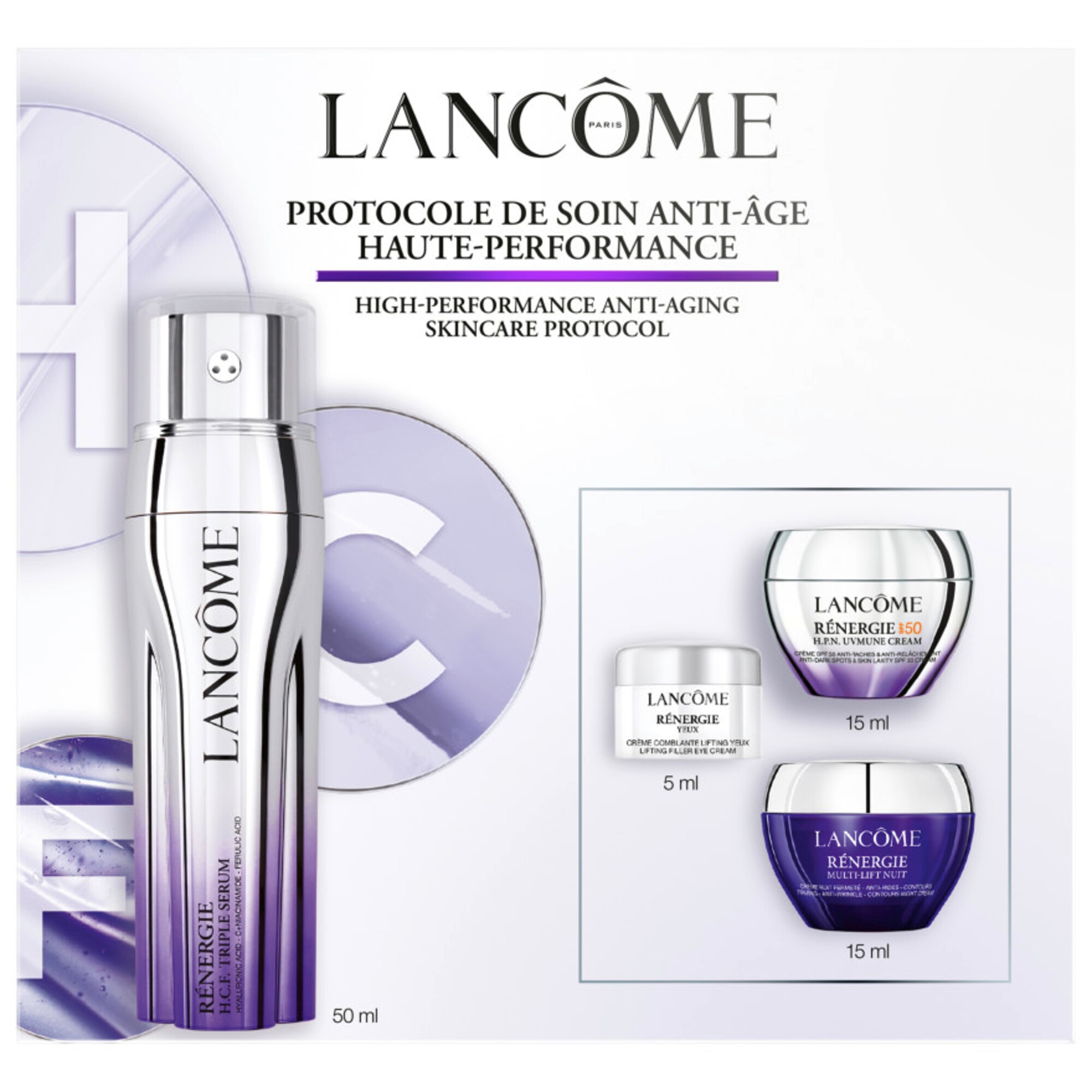 Entdecke die ultimative Anti-Aging-Routine mit dem Lanc�me R�nergie Set. Dieses Komplettset enth�lt das innovative R�nergie H.C.F. Triple Serum, eine bahnbrechende Formel mit Hyalurons�ure, Vitamin C + Niacinamid und Ferulas�ure zur Bek�mpfung von Volumenverlust, Falten und Pigmentflecken. Das Programm enth�lt au�erdem die R�nergie Augencreme f�r mit Feuchtigkeit versorgte, strahlende Augen, die R�nergie Multi-Lift Nachtcreme zur Straffung �ber Nacht und UVMUNE SPF 50 zum Schutz vor lichtbedingter Hautalterung. Gemeinsam regenerieren diese hochwirksamen Formeln die Haut Schicht f�r Schicht und sorgen f�r eine straffere, aufgepolsterte, strahlende und jugendliche Haut.