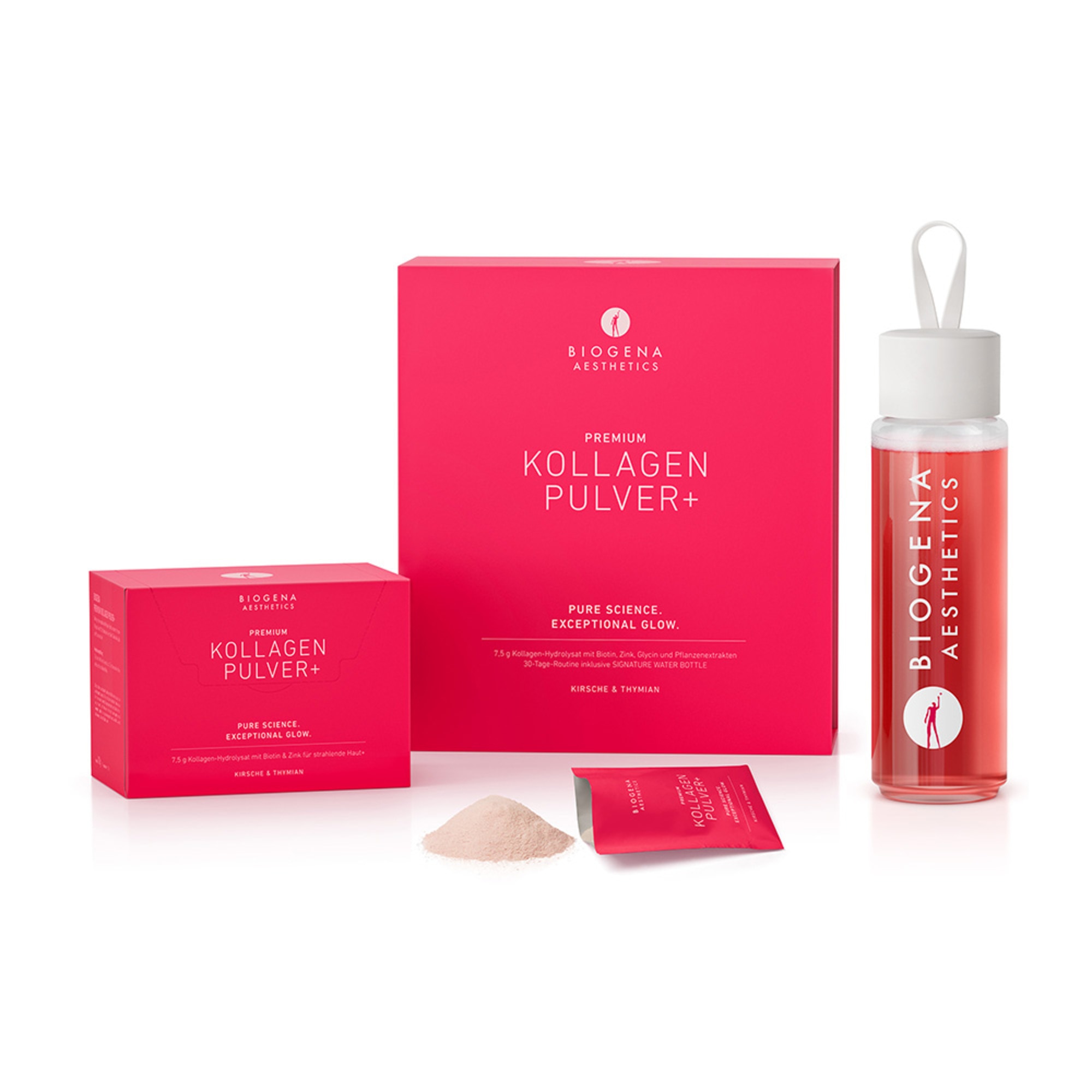Tauche in die außergewöhnliche Welt des Glows ein, in der du von innen heraus strahlst: Als Collagen Pulver mit einer super-fruchtigen Kirsch-Thymian-Geschmacksexplosion, liefert BIOGENA AESTHETICS Kollagen Pulver+ den Premium-Blend mit dem „+“, dem gewissen Extra in Form von mit wissenschaftlicher Expertise sorgfältig ausgewählten Inhaltsstoffen.