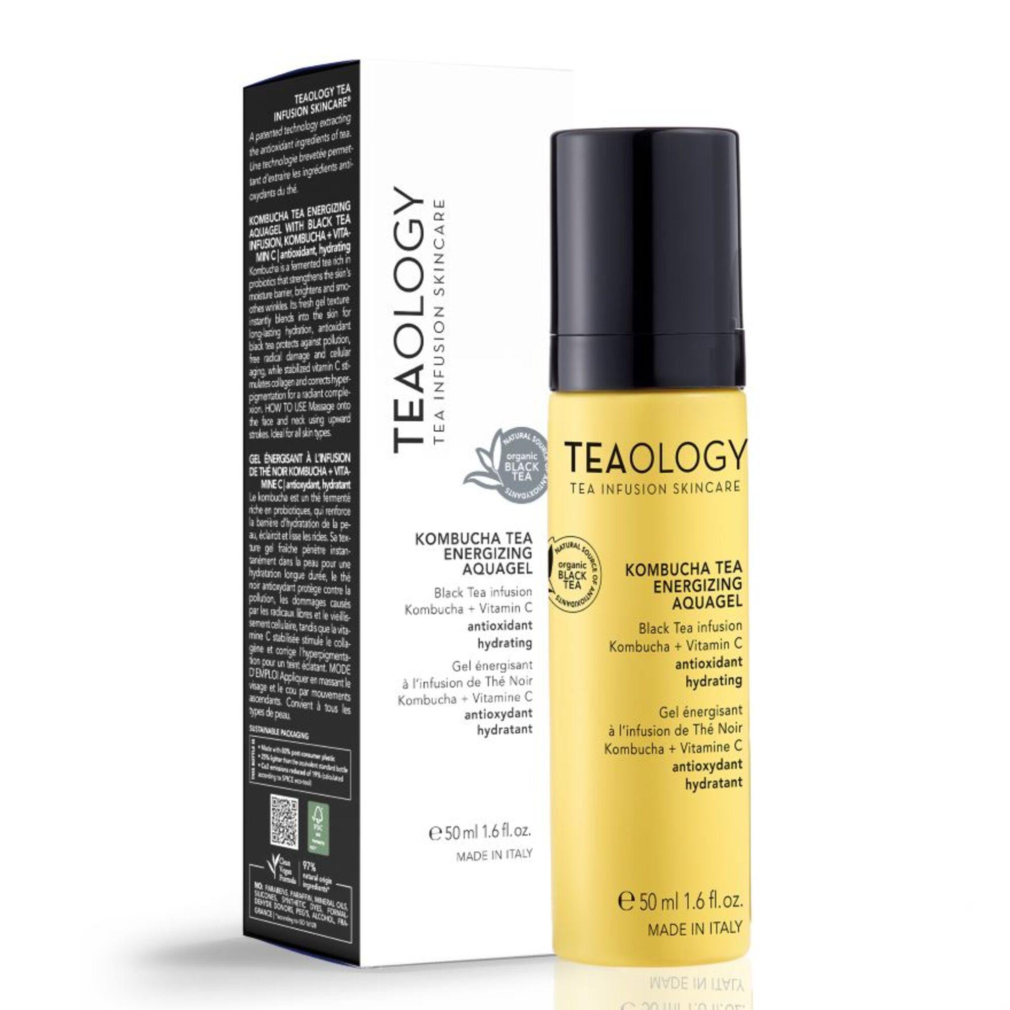 Kombucha ist ein fermentierter Tee, der reich an Probiotika ist, die Feuchtigkeitsbarriere der Haut stärkt, sie strahlen lässt und Falten glättet. Seine frische Geltextur verschmilzt sofort mit der Haut und spendet langanhaltende Feuchtigkeit, antioxidativer Schwarztee schützt vor Umweltverschmutzung, Schäden durch freie Radikale und Zellalterung, während stabilisiertes Vitamin C die Kollagenproduktion anregt und Hyperpigmentierung korrigiert, für einen strahlenden Teint.