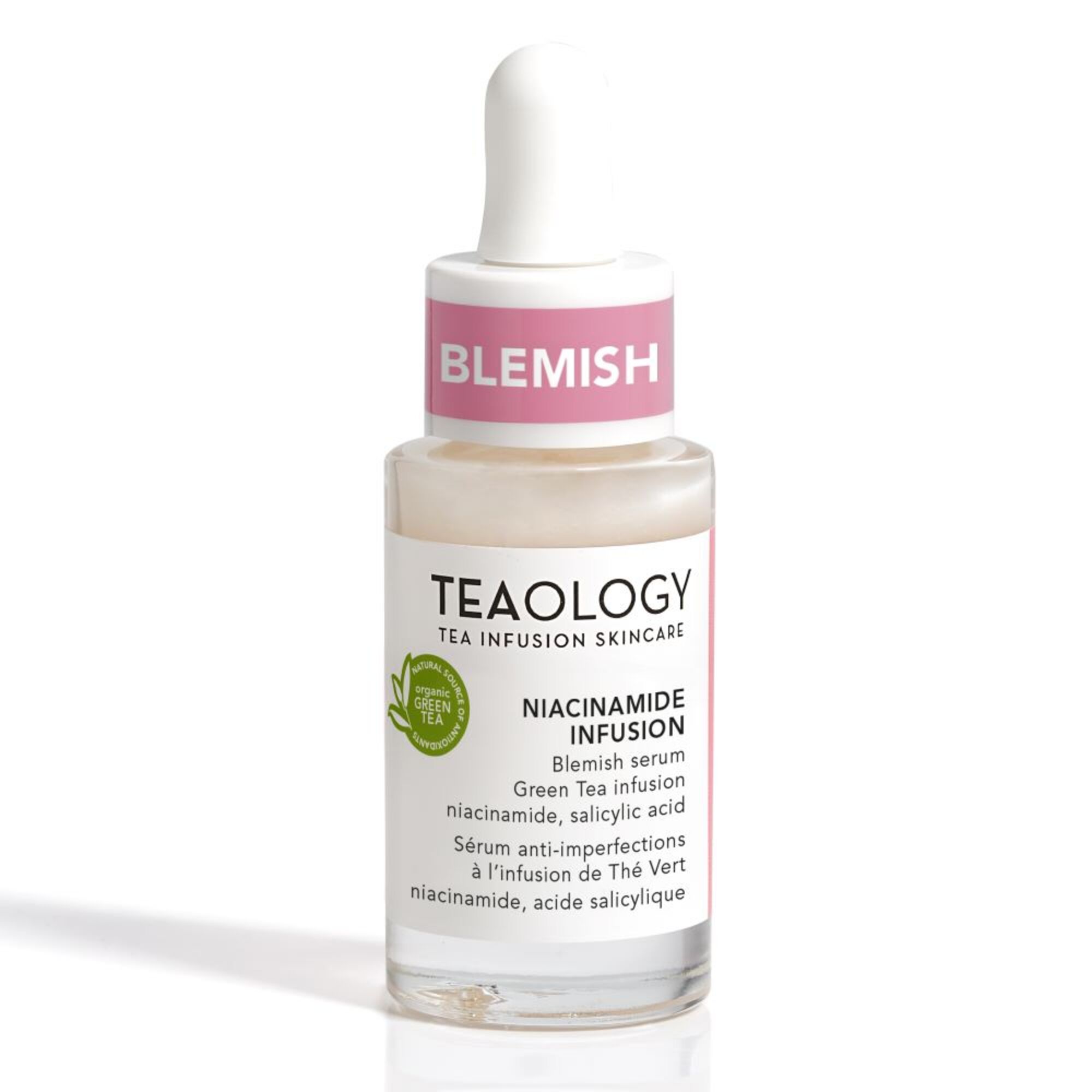 Aqua/water/eau (*), Niacinamide, Corn starch modified, Hexyl laurate, Propanediol, Ammonium acryloyldimethyltaurate/VP copolymer, Camellia sinensis leaf (organic green tea) (*), Hydroxyacetophenone, Caprylyl glycol, Sodium hyaluronate, Salicylic acid, 1,2-Hexanediol, Bakuchiol, Camellia sinensis leaf extract, Sodium gluconate, Diethylhexyl syringylidenemalonate, Maltodextrin, Tocopherol, Lactobacillus ferment, Citric acid, Caprylic/capric triglyceride, Sodium benzoate, Potassium sorbate, Beta-sitosterol, Squalene. (*) tea infusion