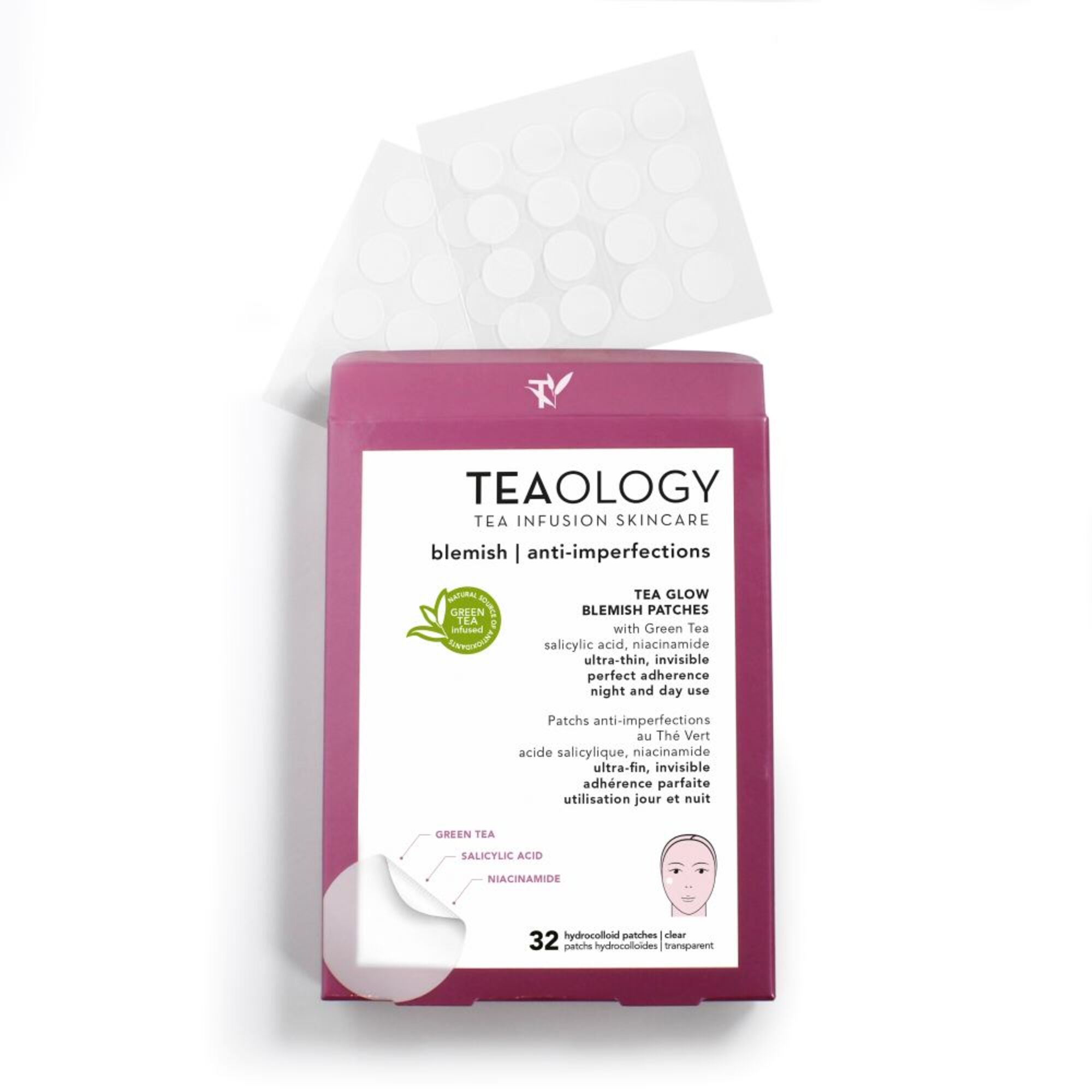 Ein klares Pflaster, das die Hydrokolloid-Technologie mit der reinigenden Kraft des grünen Tees kombiniert, um Pickel leicht zu behandeln und die Hauterneuerung zu fördern. Hydrokolloid ist ein Material, das eine schützende Barriere bildet, Talg und Unreinheiten absorbiert und den Pickel innerhalb von 6-8 Stunden kleiner und flacher werden lässt. Dieses hauchdünne, matte Pflaster verschmilzt nahtlos mit der Haut und setzt Wirkstoffe frei: porenverstopfende Salicylsäure, grüner Tee und Niacinamid, die das Hautbild verbessern. Seine Wirkung ist sichtbar, da sich das Pflaster weiß färbt, wenn es Unreinheiten absorbiert.